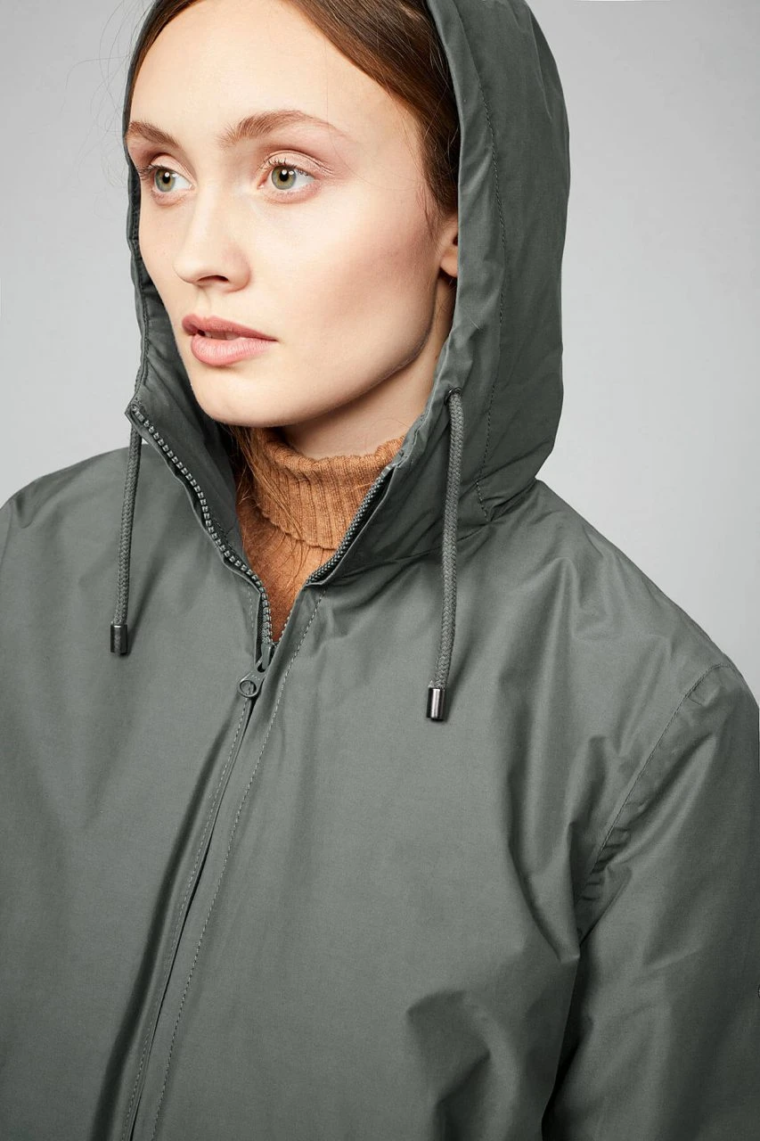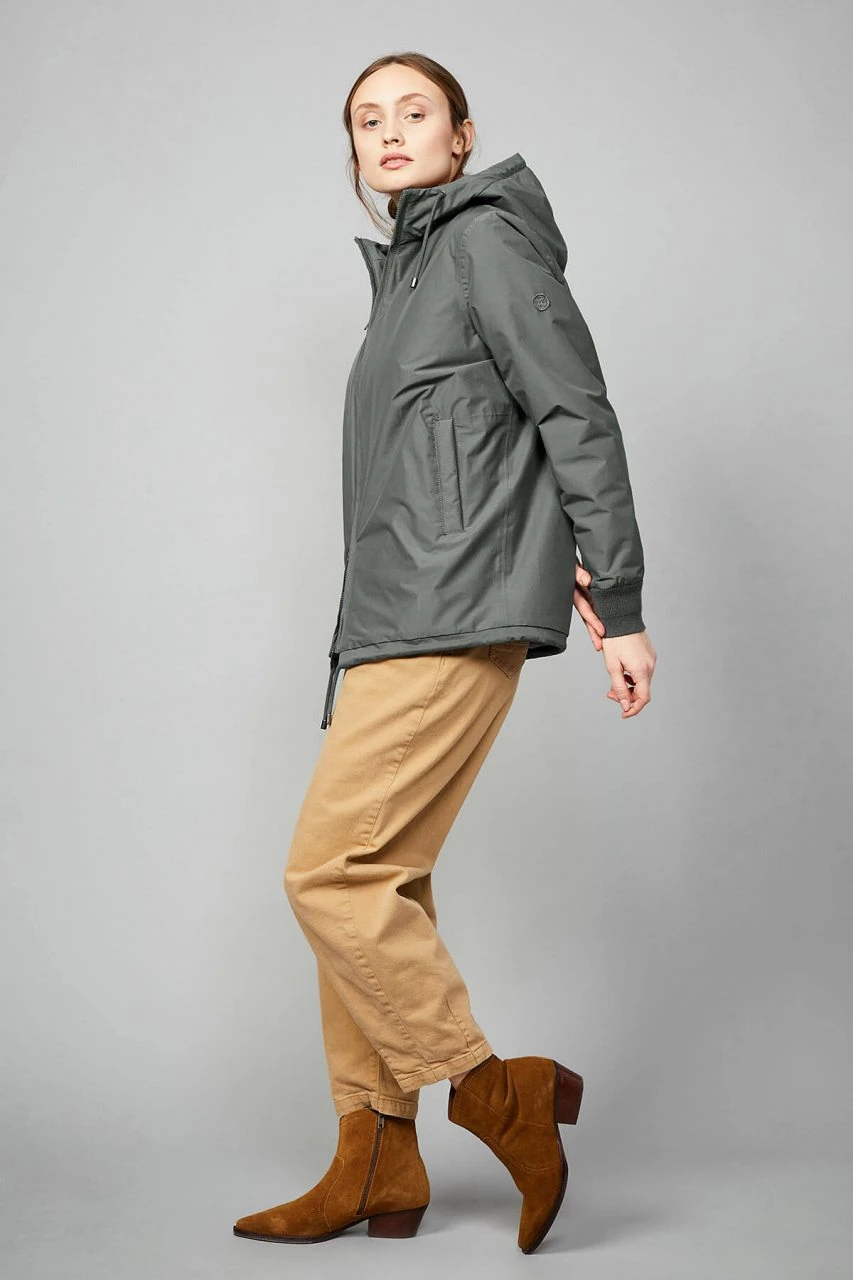 Alleena ist eine stilsichere, urbane Winterjacke aus langlebigem Materialmix aus Bio-Baumwolle und recyceltem Nylon mit wetterfester Polyurethan-Membran. Die wasserabweisende Jacke mit gefütterter Kapuze ist gerade geschnitten, über eine Kordel kann die Weite des Hüftsaums angepasst werden. Eine Wattierung aus recyceltem Polyester hält bei kalten Temperaturen warm, das Jersey-Futter aus TENCEL™ Lyocell ist angenehm weich. Dank der zwei seitlichen Eingrifftaschen sind die nötigsten Dinge immer schnell zur Hand. Zwei große Druckknopf-Taschen an der Innenseite bieten zusätzlichen Stauraum. Die Strickbündchen an den Ärmelenden und der hoch schließende Kragen sorgen für einen zuverlässigen Schutz vor Wind und Kälte.