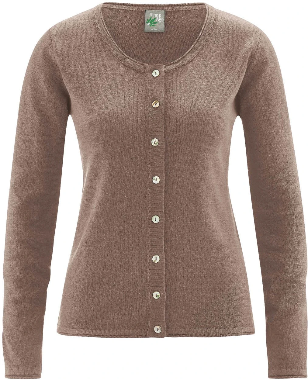 Klassischer Damen Cardigan aus 38% Hanf (recycelt), 32% Bio-Baumwolle (recycelt) und 30% Bio-Baumwolle. Die Feinstrick-Jacke in normaler Passform kommt mit Rundhalsausschnitt und durchgehender Knopfleiste (Perlmutt-Knöpfe). Die Abschlüsse am Ausschnitt, an den Ärmeln und an der Hüfte sind leicht aufgerollt.