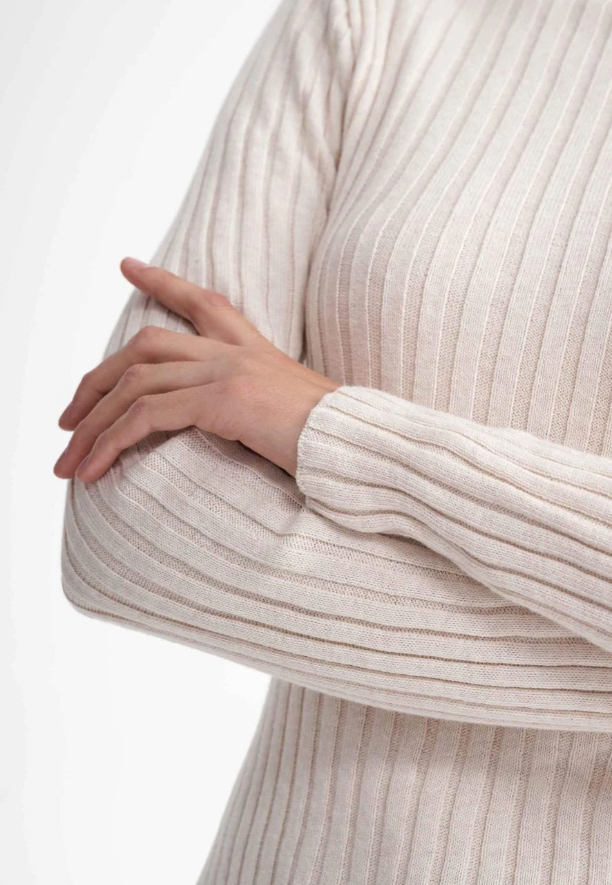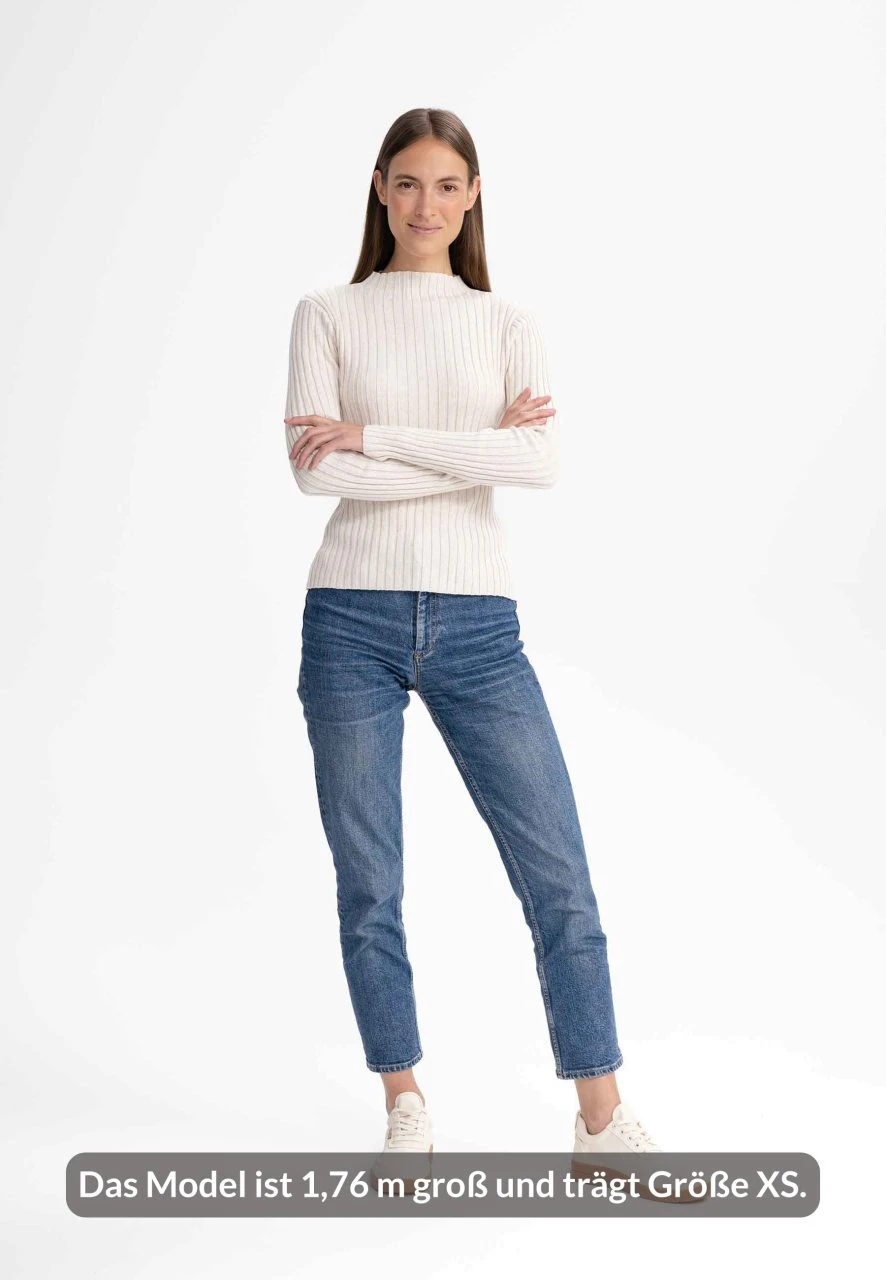 Leichter Strickpullover aus reiner Fairtrade Bio-Baumwolle. Durch seine Rippstruktur ist der Pulli auf natürliche Weise – ohne den Einsatz von Elastan – elastisch und bietet so eine figurbetonte, modische Silhouette, die durch den Stehkragen abgerundet wird.