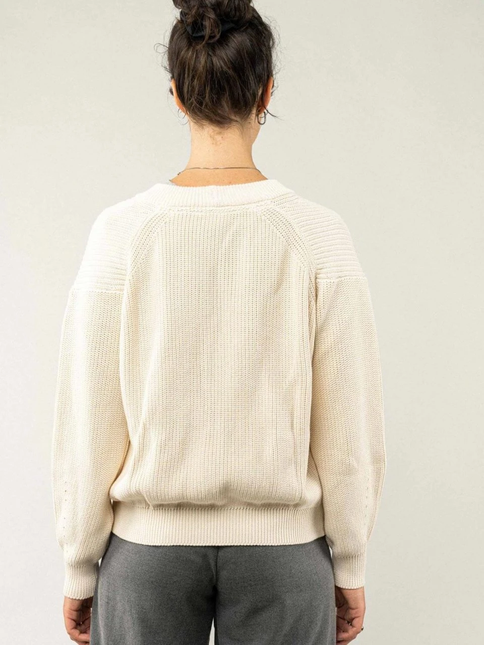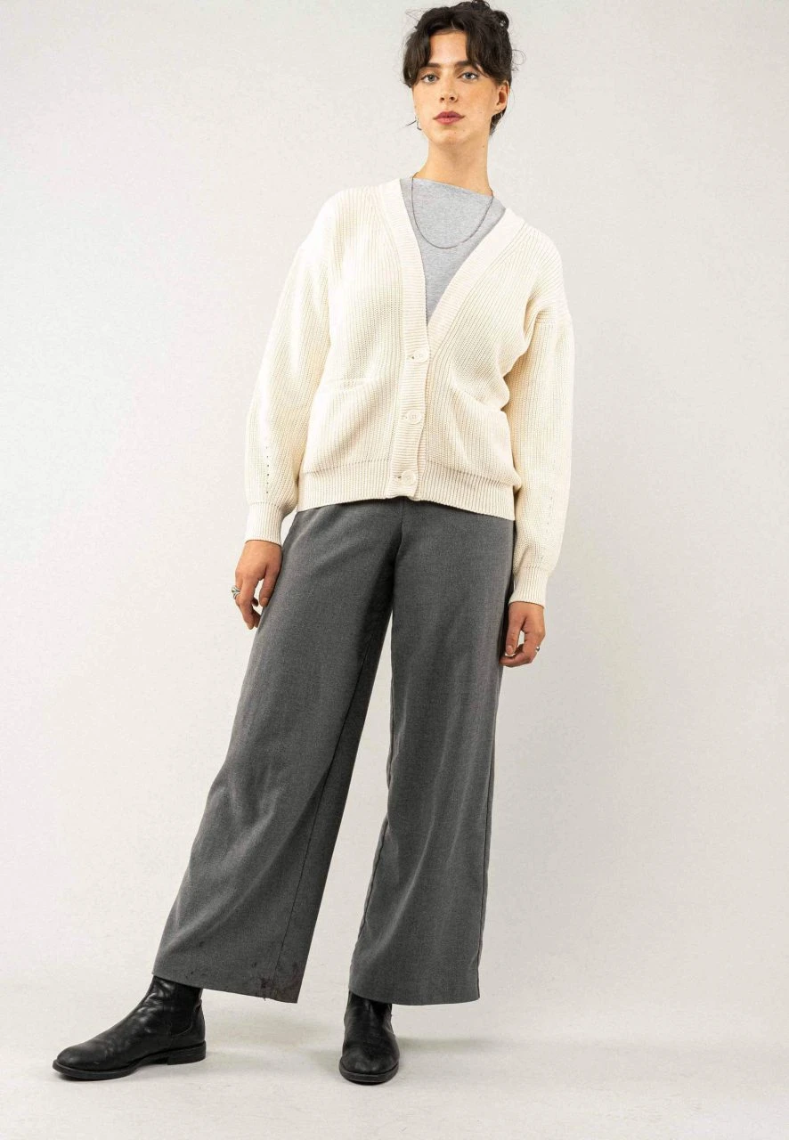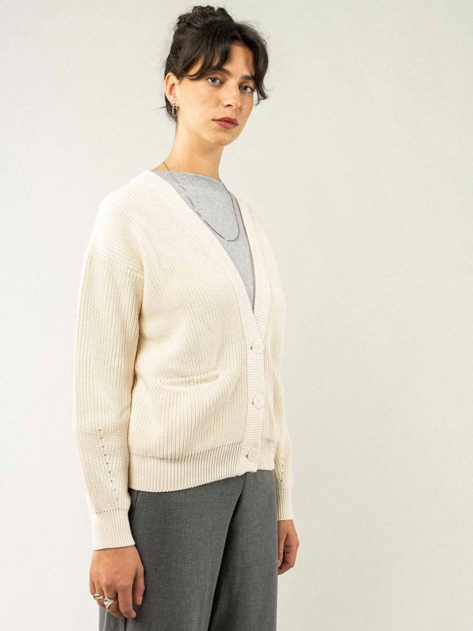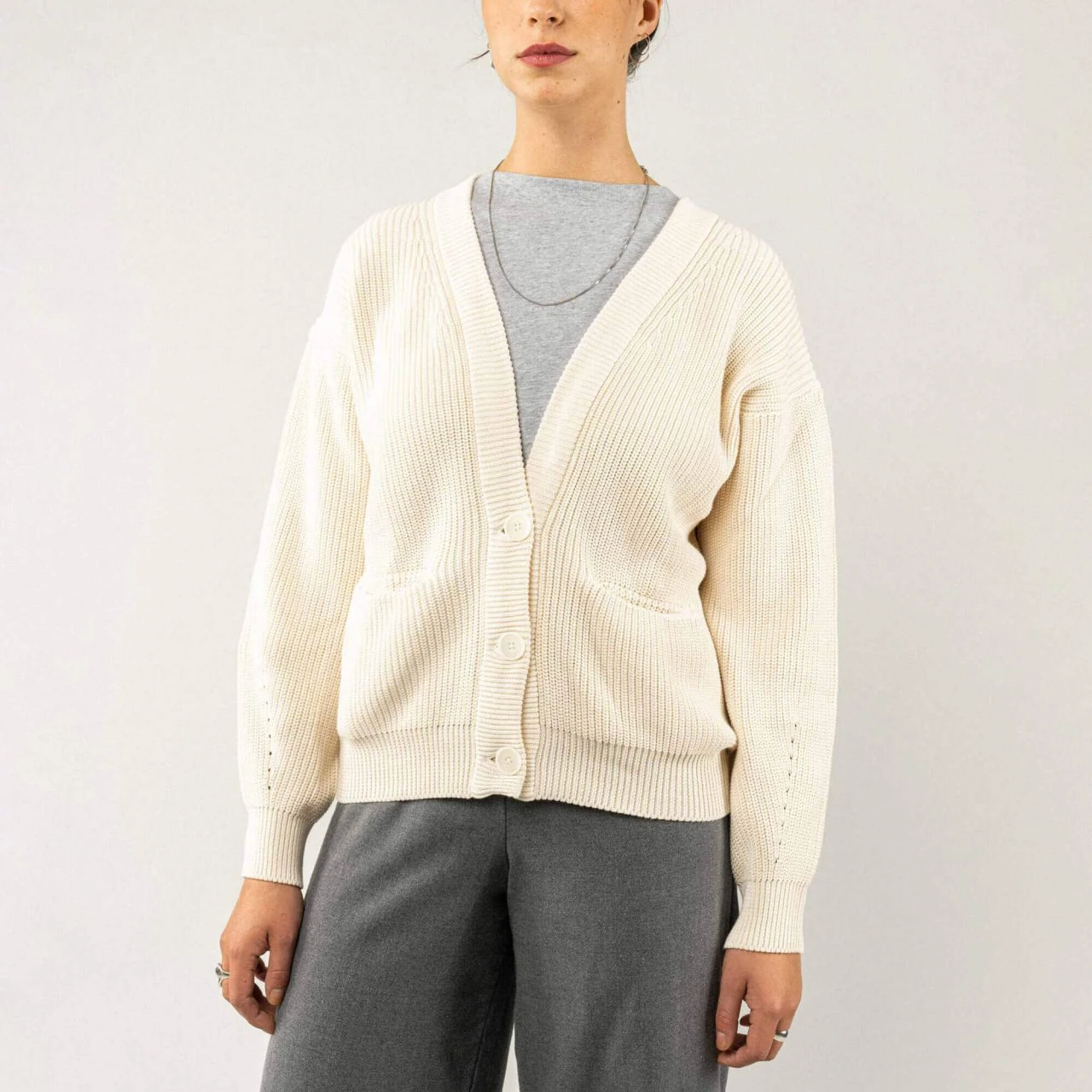 Locker und eher kurz geschnittener Cardigan aus reiner Fairtrade Bio-Baumwolle. Die Strickjacke kommt mit tiefem V-Ausschnitt, überschnittenen Schultern und breiten Bündchen an Ärmel- und Hüftabschlüssen. Die Knopfleiste ist mit drei großen Knöpfen aus Steinnuss versehen. Der schwere und kuschelig warme Rippstrick ist vorgewaschen, somit bleibt die Passform erhalten.