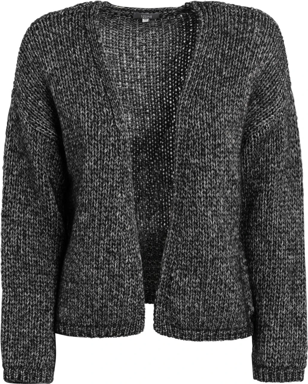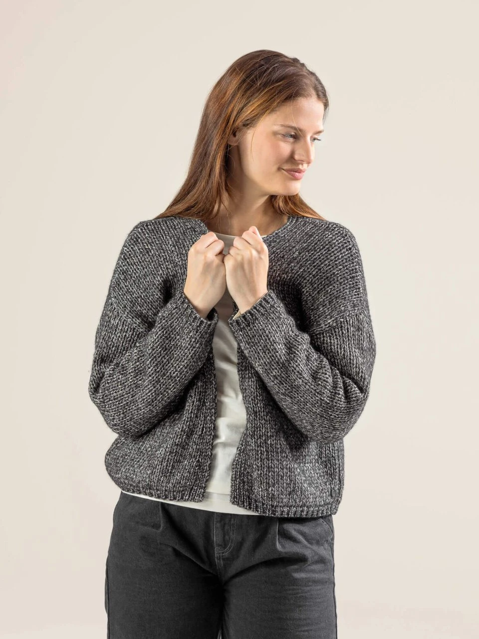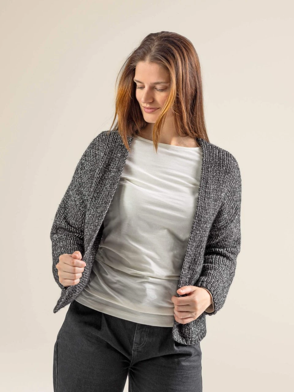 Kuschelig weich und wärmend zugleich: Die offene Strickjacke »Palila« aus Bio-Baumwolle und Bio-Wolle rundet jedes deiner Outfits ab. Die grobmaschig gestrickte Jacke in legerer und kürzerer Passform passt dank der schwarz-weiß melierten Farbe praktisch zu allem.