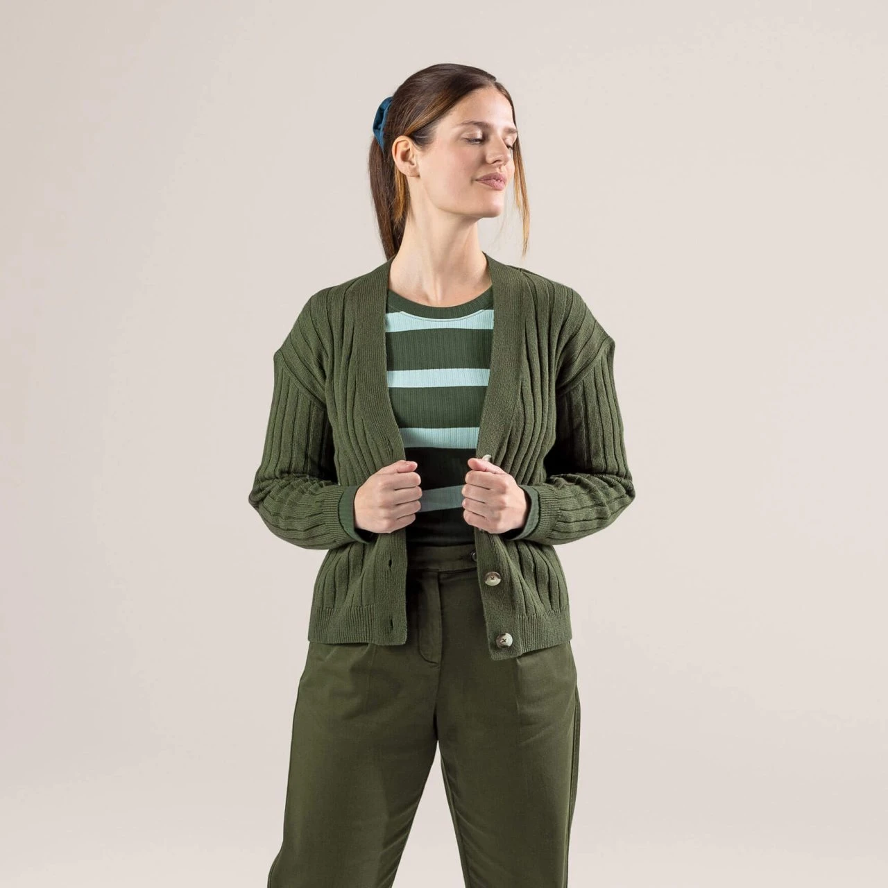 Kalte Temperaturen sind nur halb so schlimm, wenn man die schöne Strickjacke »Pirala« aus dem Kleiderschrank nehmen kann. Der feine Stoff besteht aus reinen Naturfasern in einem angenehm wärmenden Mix aus Bio-Baumwolle und Bio-Wolle. Der modische Cardigan mit V-Ausschnitt ist locker geschnitten. Die großen, markanten Knöpfe und die Streifenstruktur runden jedes Winter-Outfit ab.