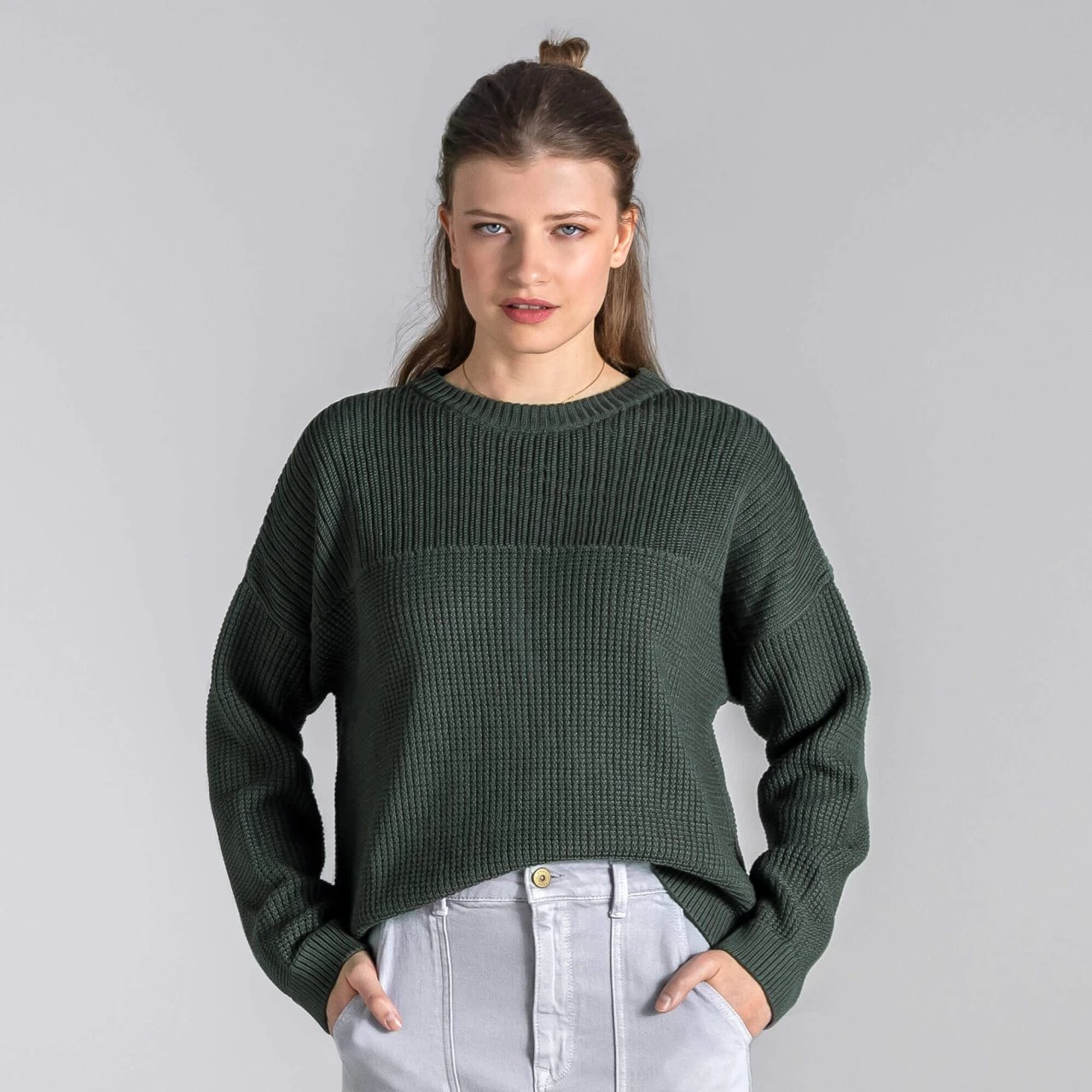 Locker geschnittener Strickpullover aus reiner Bio-Baumwolle. Der Pullover mit überschnittenen Schultern wird durch einen Mix aus zwei Strickmustern und abgesetzten Bündchen an Saum und Ärmeln optisch abgerundet. Die verwendete Baumwolle kommt in Pima-Qualität, die sich durch ihre extralange Faserlänge auszeichnet, und erhält durch ein zusätzliches Veredelungsverfahren („Mercerisation„) eine hohe Festigkeit und einen schönen Glanz.