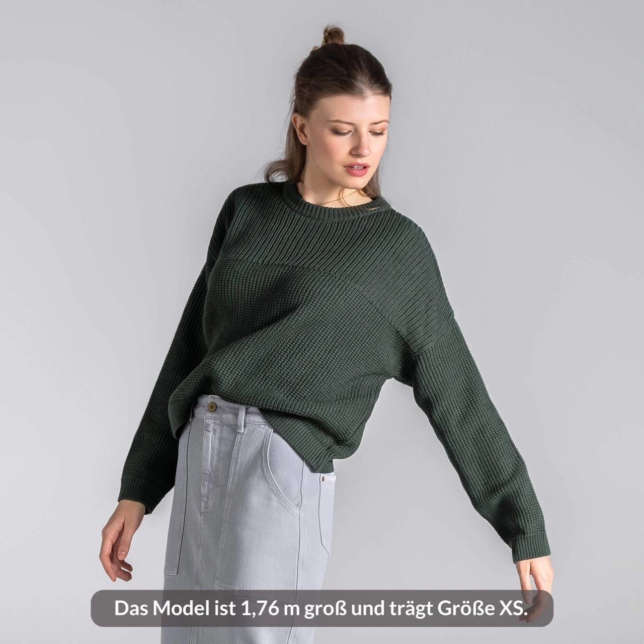 Dieser vegane Strickpullover »Beeke« wird unter fairen Bedingungen hergestellt. Der Hersteller trueStory produziert sein gesamtes Sortiment unter Einhaltung strenger Sozialstandards und verzichtet dabei völlig auf bedenkliche Chemikalien.