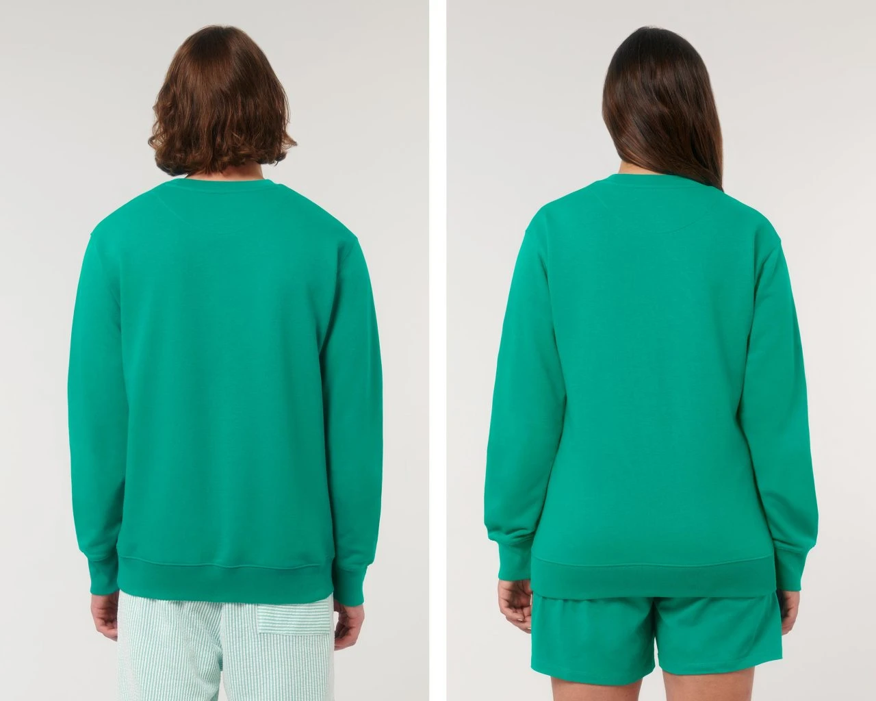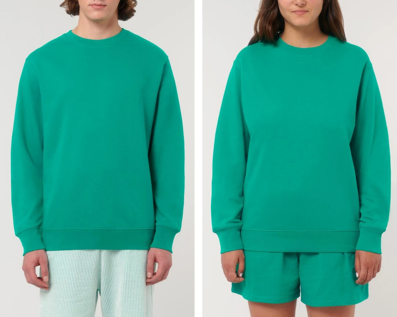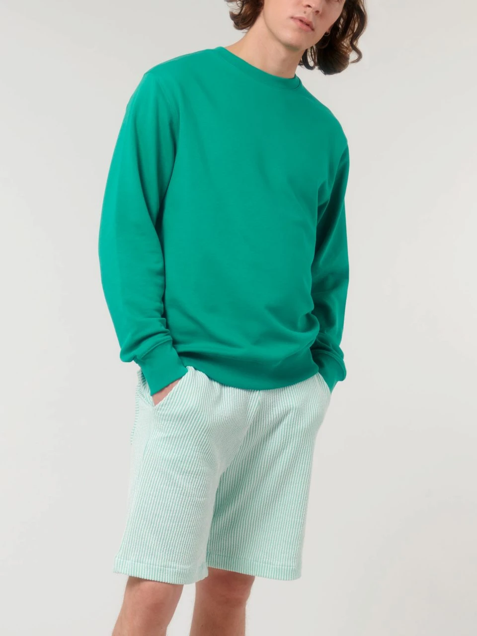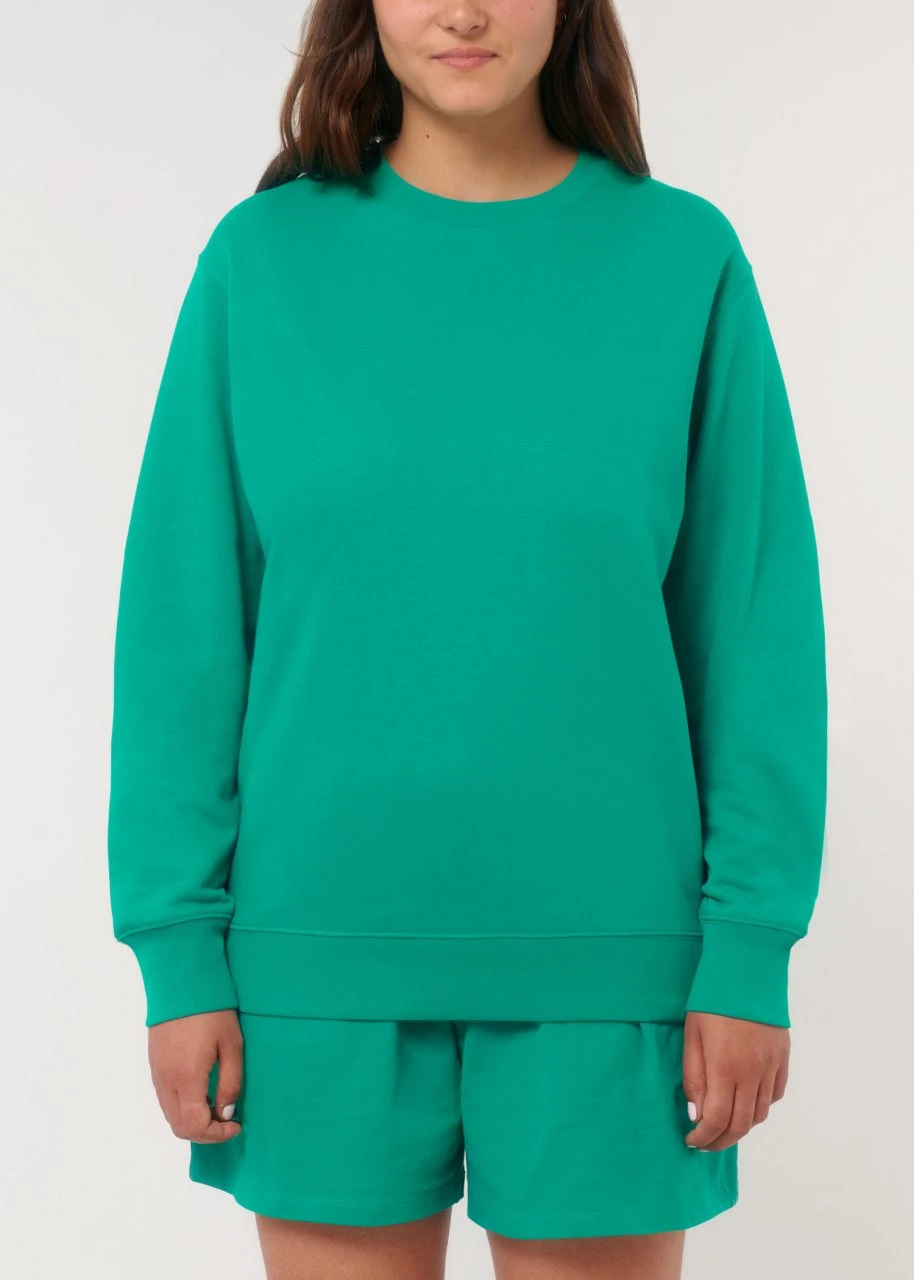 Medium Fit Sweatshirt aus Bio-Baumwolle und 15% recyceltem Polyester. Der klassische Rundhals-Pullover kommt im geraden Unisex-Schnitt. Hüft, Hals- und Ärmelabschlüsse sind mit einem feinen Rippbündchen eingefasst. Der Terry-Sweatstoff mit einem Gewicht von 300 g/m² und der Innenseite in Schlingenstruktur bietet das ganze Jahr über hohen Tragekomfort.