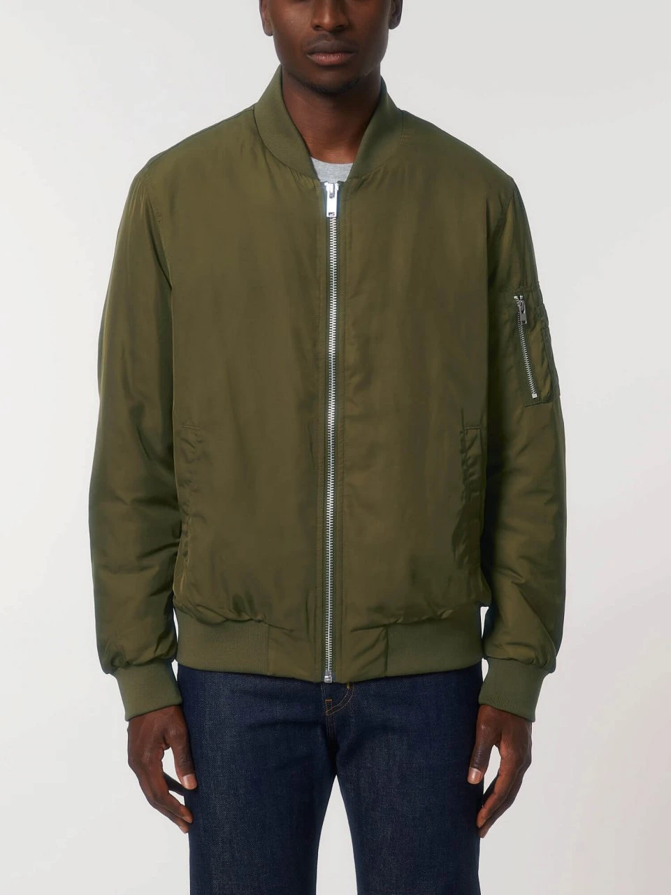 Hochwertige Unisex Bomber-Jacke aus recyceltem Polyester. Die leichte Wattierung und die wasserabweisende, fluorfreie Beschichtung des samtigen Twill-Oberstoffs bieten hohen Tragekomfort bei ungemütlichem Wetter. Die Kragen, Ärmel- & Hüftabschlüsse sind mit breiten Rippbündchen versehen. Geschlossen wird der Blouson mit silberfarbenem Reißverschluss und großem Schieber aus Metall. Die Jacke kommt mit zwei seitlichen Eingrifftaschen und einer innenliegenden Brusttasche, jeweils mit einem Druckknopf. Zusätzlich ist am linken Ärmel eine kleine Reißverschlusstasche mit vier Stifteinschüben aufgenäht.