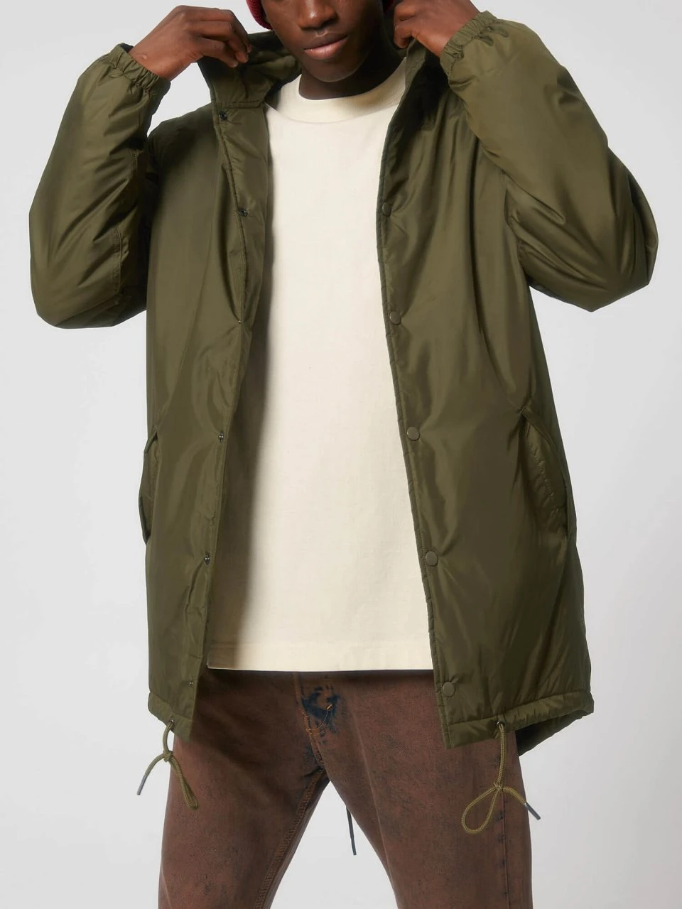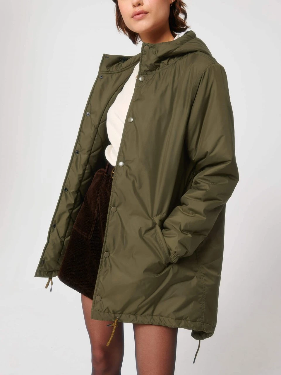 Leicht wattierter Unisex Parka aus recyceltem Polyester. Die Außenseite besteht aus glattem Taftgewebe. Die Jacke ist lang und bequem geschnitten, sodass sie ohne Probleme in Kombination mit dicken Pullovern getragen werden kann. Die leichte Wattierung, mit der die gesamte Jacke ausgestattet ist, und die fluorfreie, wasserabweisende Beschichtung sind die ideale Voraussetzungen, um dem ungemütlichen Herbstwetter zu trotzen. Geschlossen wird die Jacke bis zum hochabschließenden Kragen mit einer Metallknopf-Leiste. Einen zusätzlichen Reißverschluss hat sie nicht. Die Ärmeln schließen mit halb-elastischen Bündchen ab. Der Saum kann mit Kordeln und die Kapuze mit einem Gummizug und Stoppern verstellt werden. Die Übergangs-Jacke bietet außen zwei Paspeltaschen.