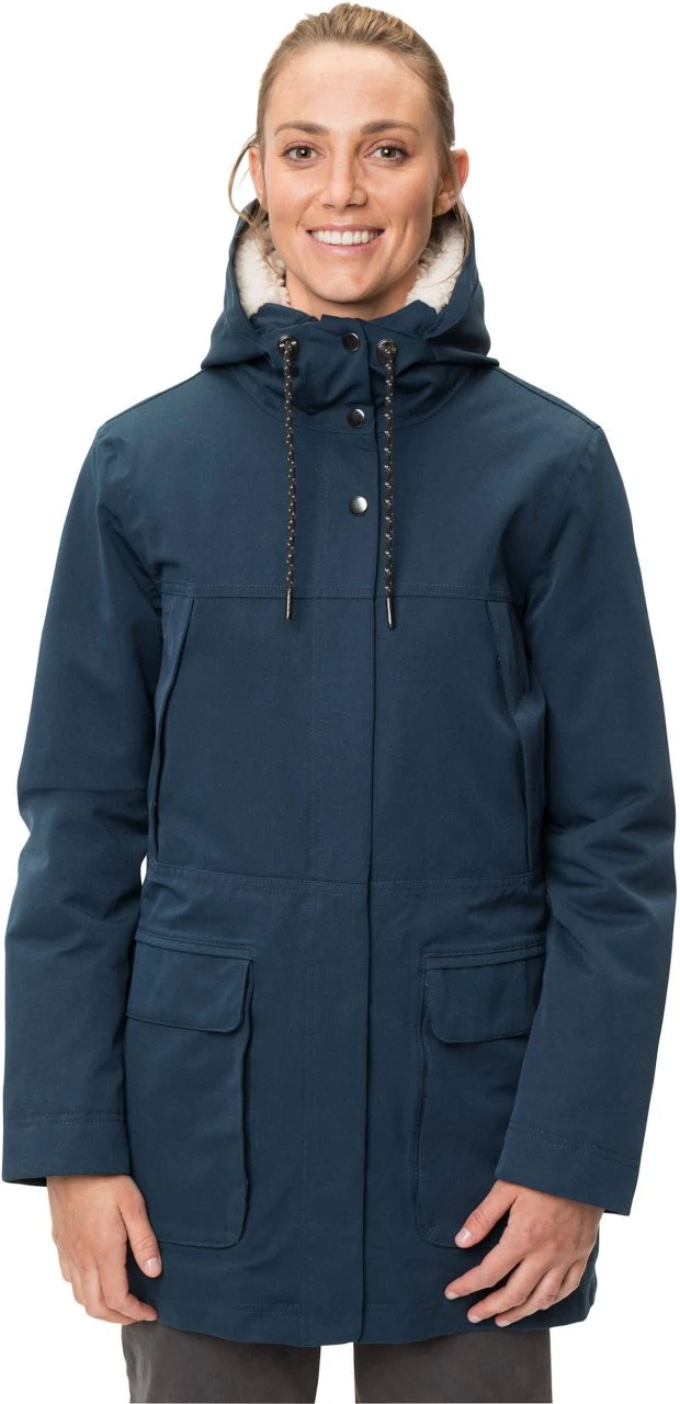 »Manukau Parka II« von VAUDE ist eine stilsichere Winterjacke für den modernen Alltag. Die Jacke ist zeitlos designt und ganz sicher auch noch im nächsten und übernächsten Winter ein zuverlässiger Begleiter – insbesondere dann, wenn es darauf ankommt und das Wetter kalt, nass und windig ist. Der Manukau Parka II ist lang geschnitten, wattiert kommt mit einer wind- und wasserdichten Membran. Durch die »Primaloft® Black Insulation« aus recyceltem Polyester und das flauschige Fellimitat in Kapuze und oberem Rücken schützt die Winterjacke stets vor Kälte, bleibt dabei aber atmungsaktiv und angenehm zu tragen. Breite, innenliegende Bündchen am Handgelenk sorgen dafür, dass keine unangenehmen Kältebrücken entstehen. Der Kragen schließt hoch ab und schützt den Halsbereich vor Kälte und Wind.