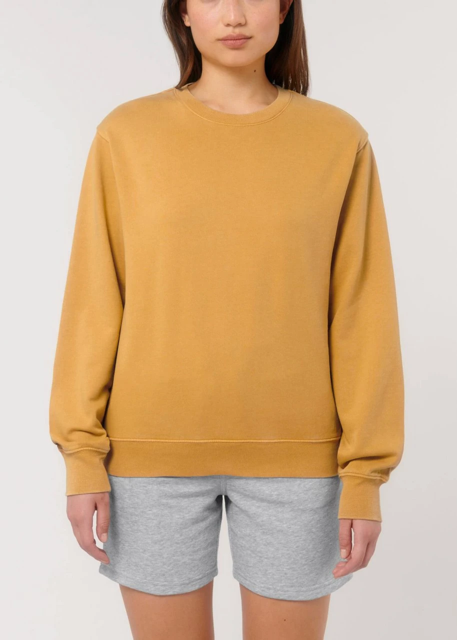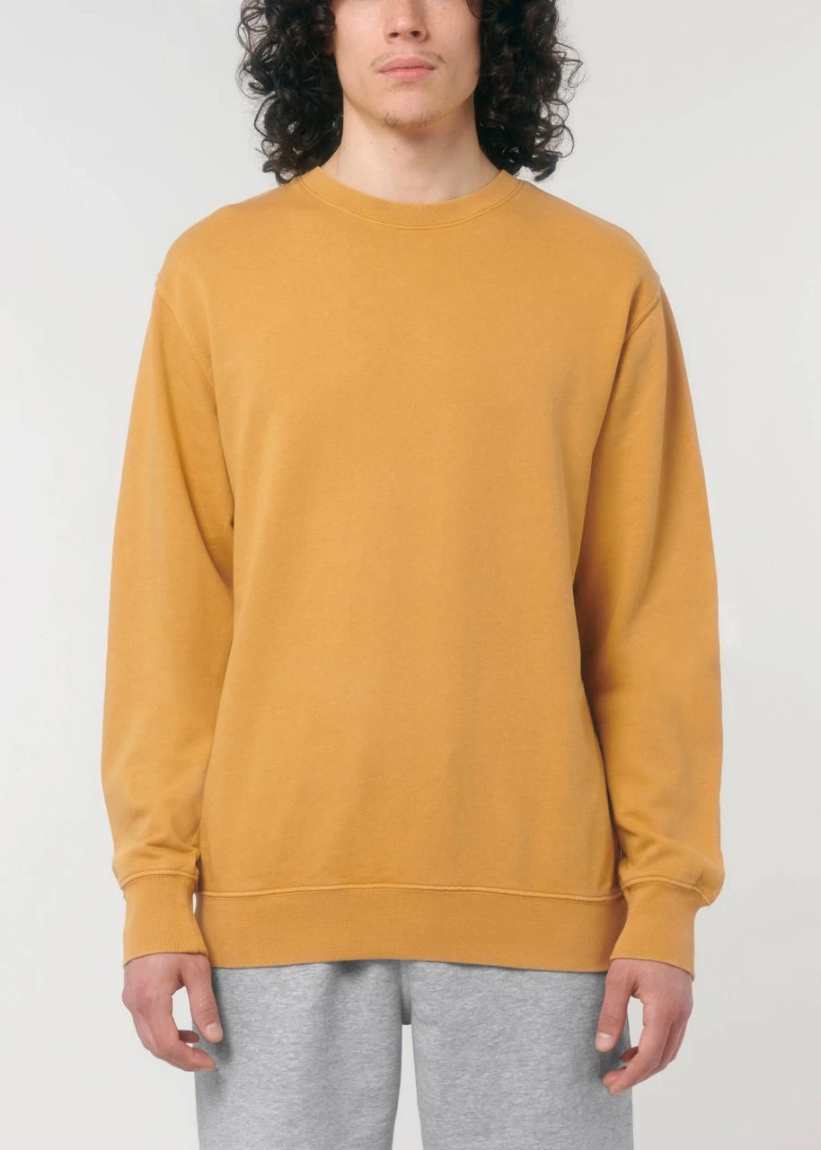 Medium Fit Vintage Sweatshirt aus Bio-Baumwolle. Der klassische Rundhals-Pullover kommt im geraden Unisex-Schnitt. Hüft, Hals- und Ärmelabschlüsse sind mit einem feinen Rippbündchen eingefasst. Der Terry-Sweatstoff mit einem Gewicht von 300 g/m² und der Innenseite in Schlingenstruktur bietet das ganze Jahr über hohen Tragekomfort.